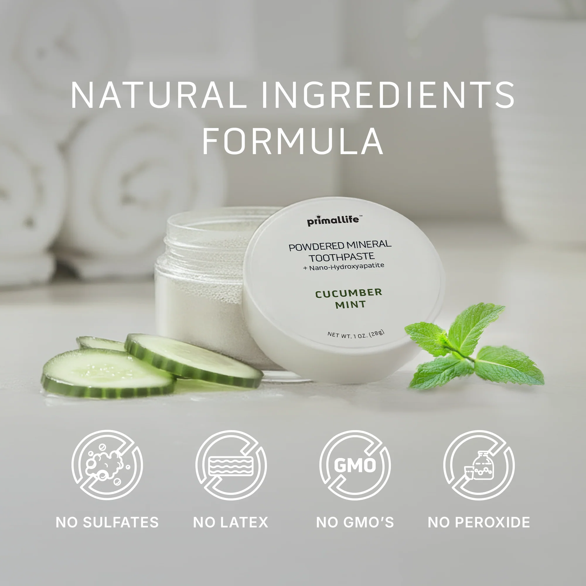 Peppermint Thyme: Bentonite, Kaolin, Sodium Bicarbonate, Natural Flavorings, Lou Han Guo (Monk Fruit), Nano-Hydroxyapatite, Montmorillonite